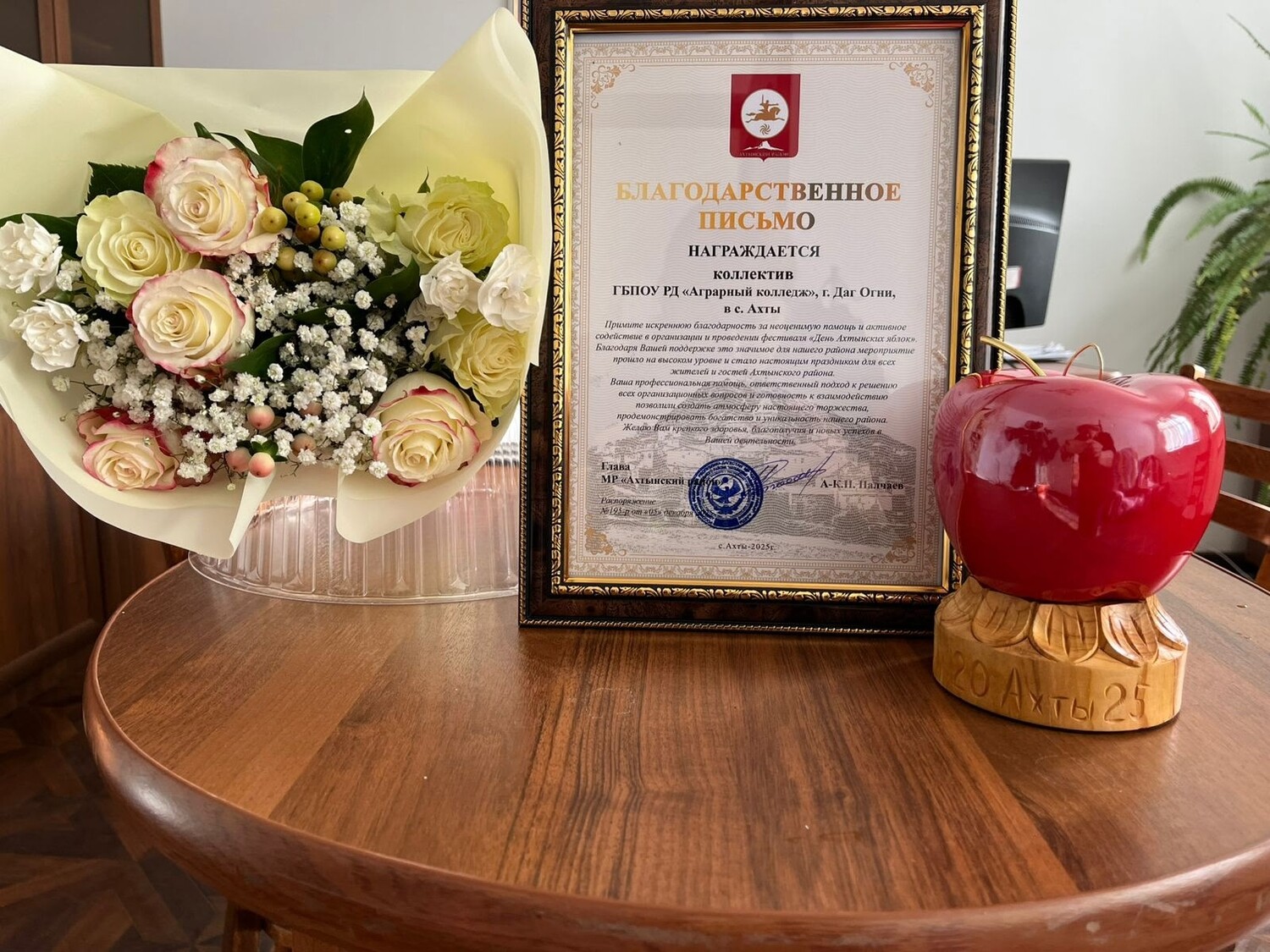 Это признание стало возможным благодаря активной помощи и содействию в организации и проведении замечательного фестиваля "День Ахтынских яблок"! Искренне рады, что наш коллектив смог внести свой вклад в это яркое и запоминающееся событие, которое объединило жителей и гостей района. Наш колледж всегда стремится быть частью важных культурных и общественных инициатив, и мы гордимся тем, что наша работа была отмечена столь значимой наградой. Выражаем глубокую признательность А-К. Н. Палчаеву за высокую оценку нашего труда и доверие! Мы продолжим с энтузиазмом поддерживать развитие района и участвовать в его жизни. |