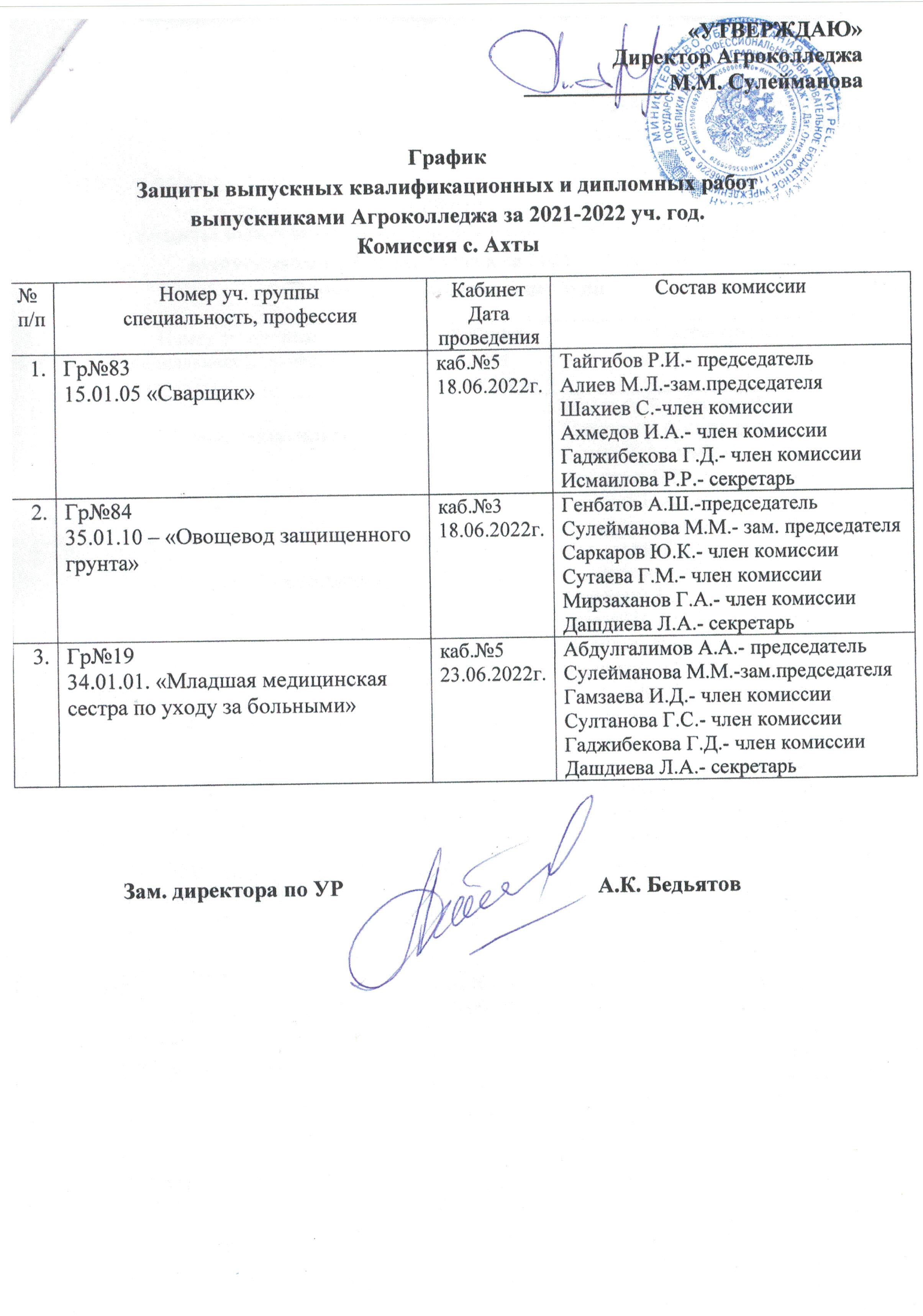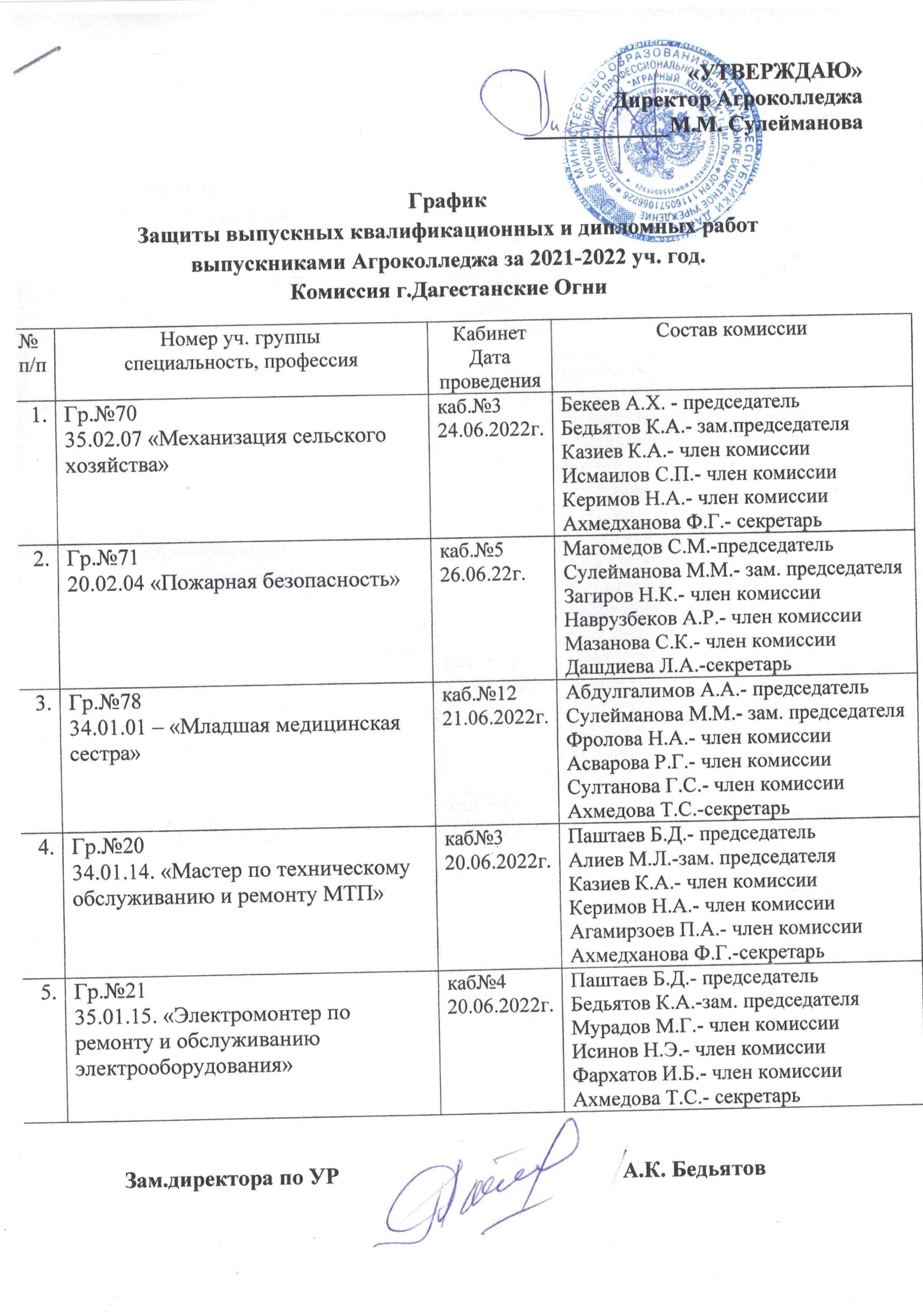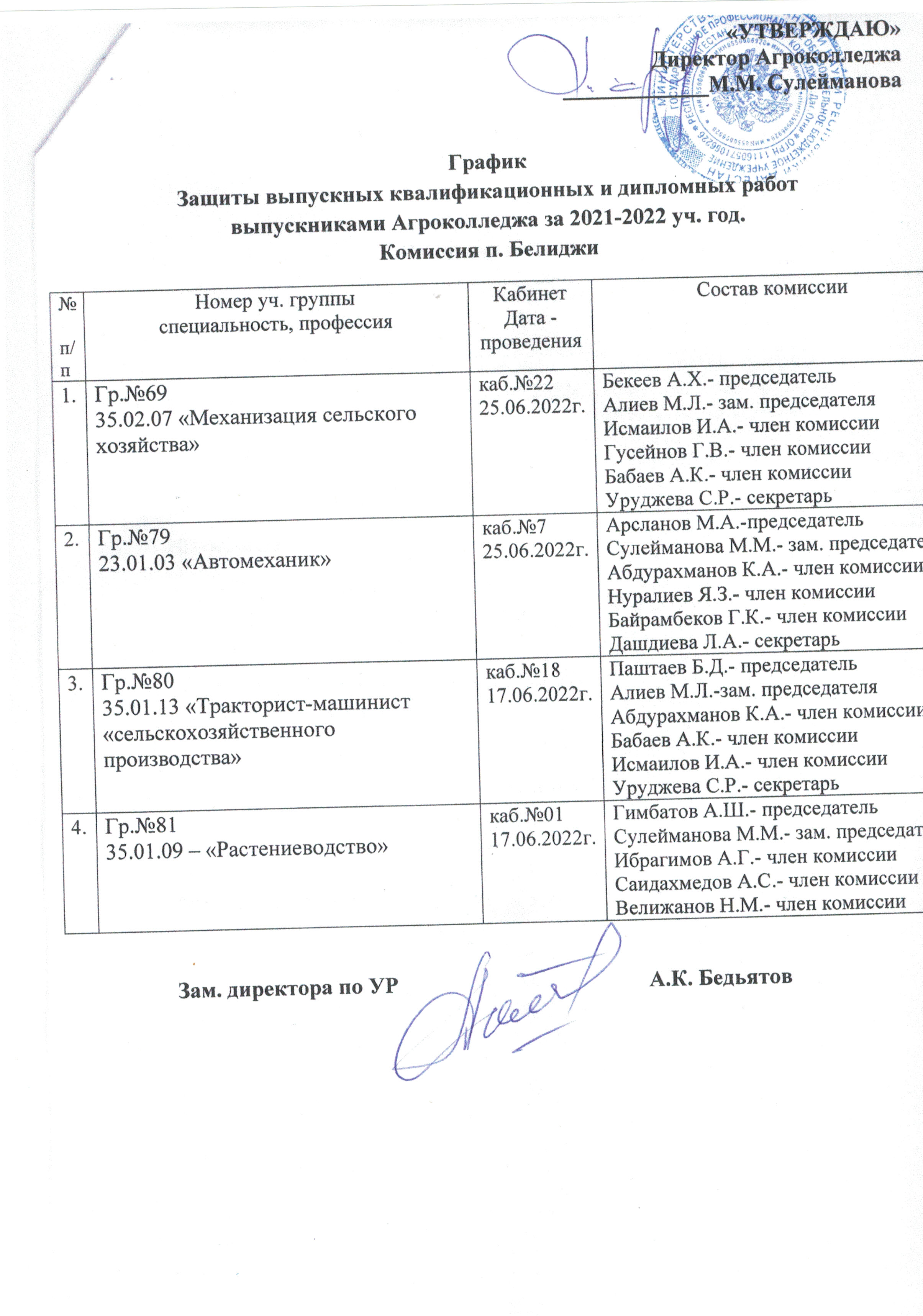 График защиты выпускных квалификационных и дипломных работ выпускниками Агроколеджа за 2021-2022 уч.год. (п. Белиджи)
