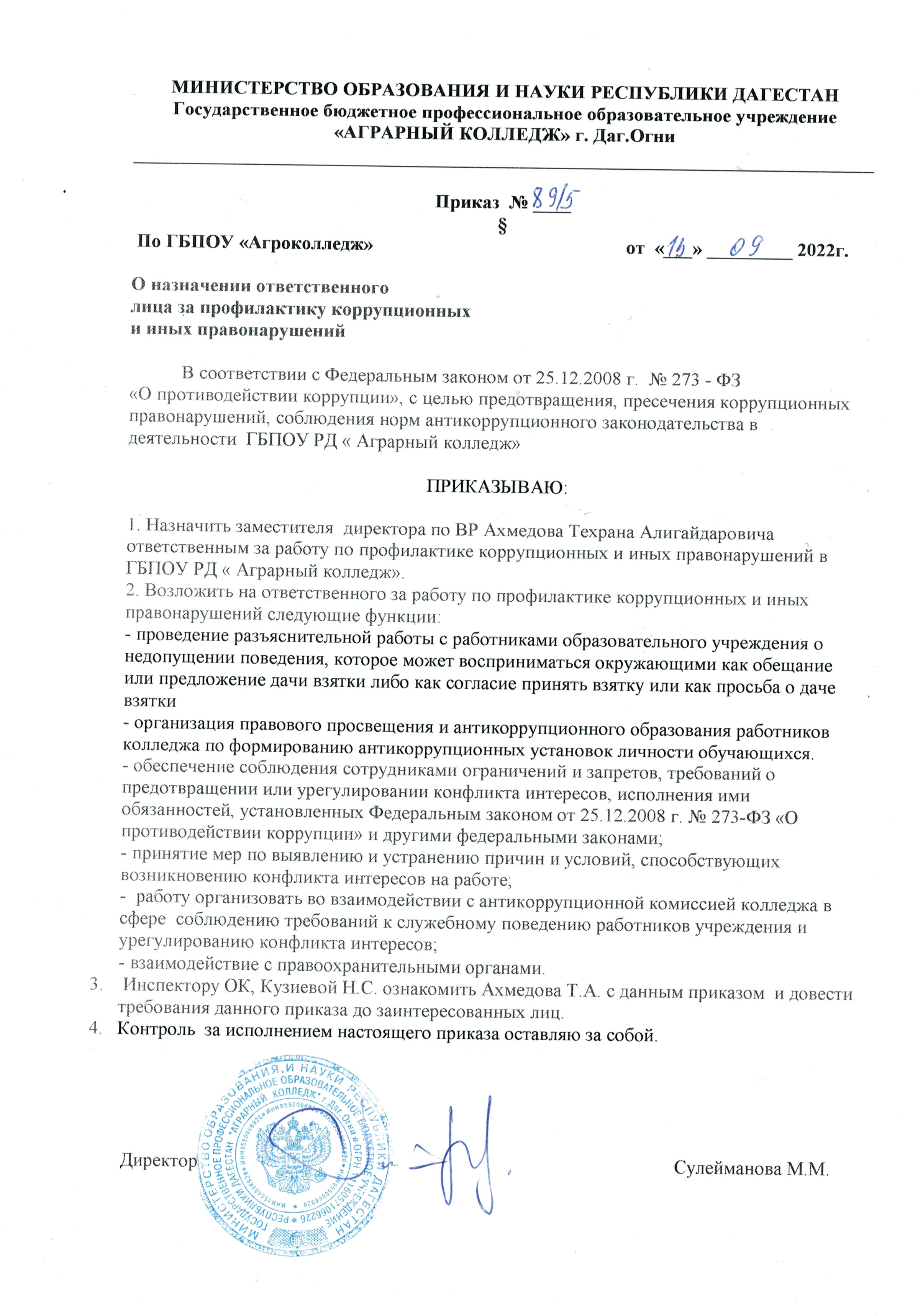 Приказ 89/4 "Об утверждении Антикоррупционной политики в ГБПОУ РД "Аграрный колледж"