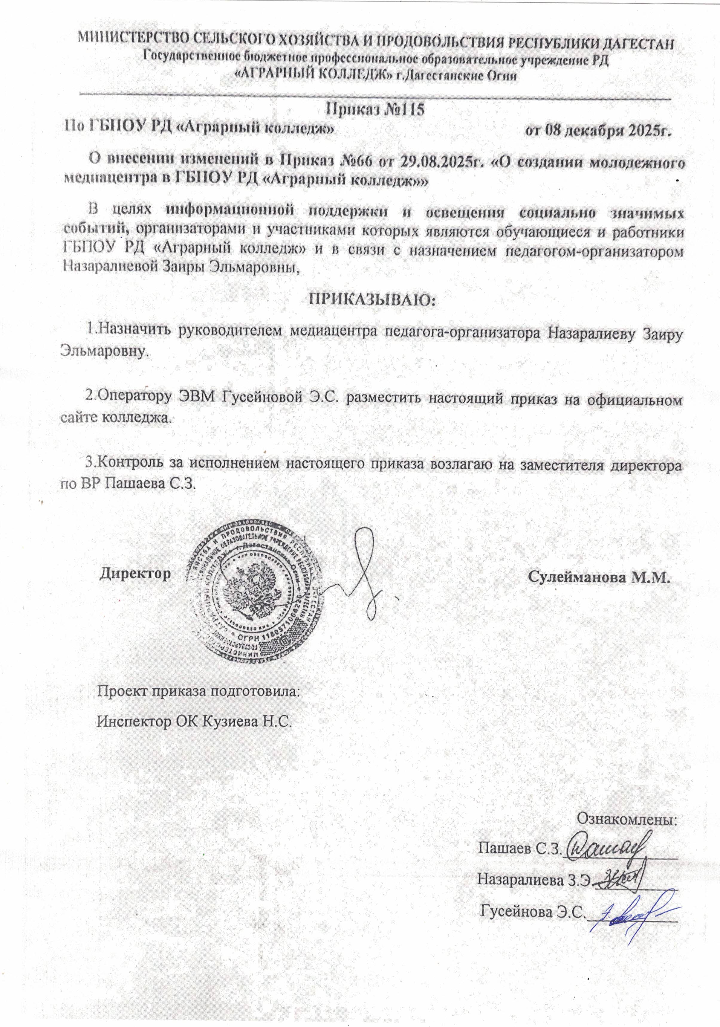 Приказ о создании молодежного медиацентра в ГБПОУ РД "Аграрный колледж" №66 от 29.08.2025г.