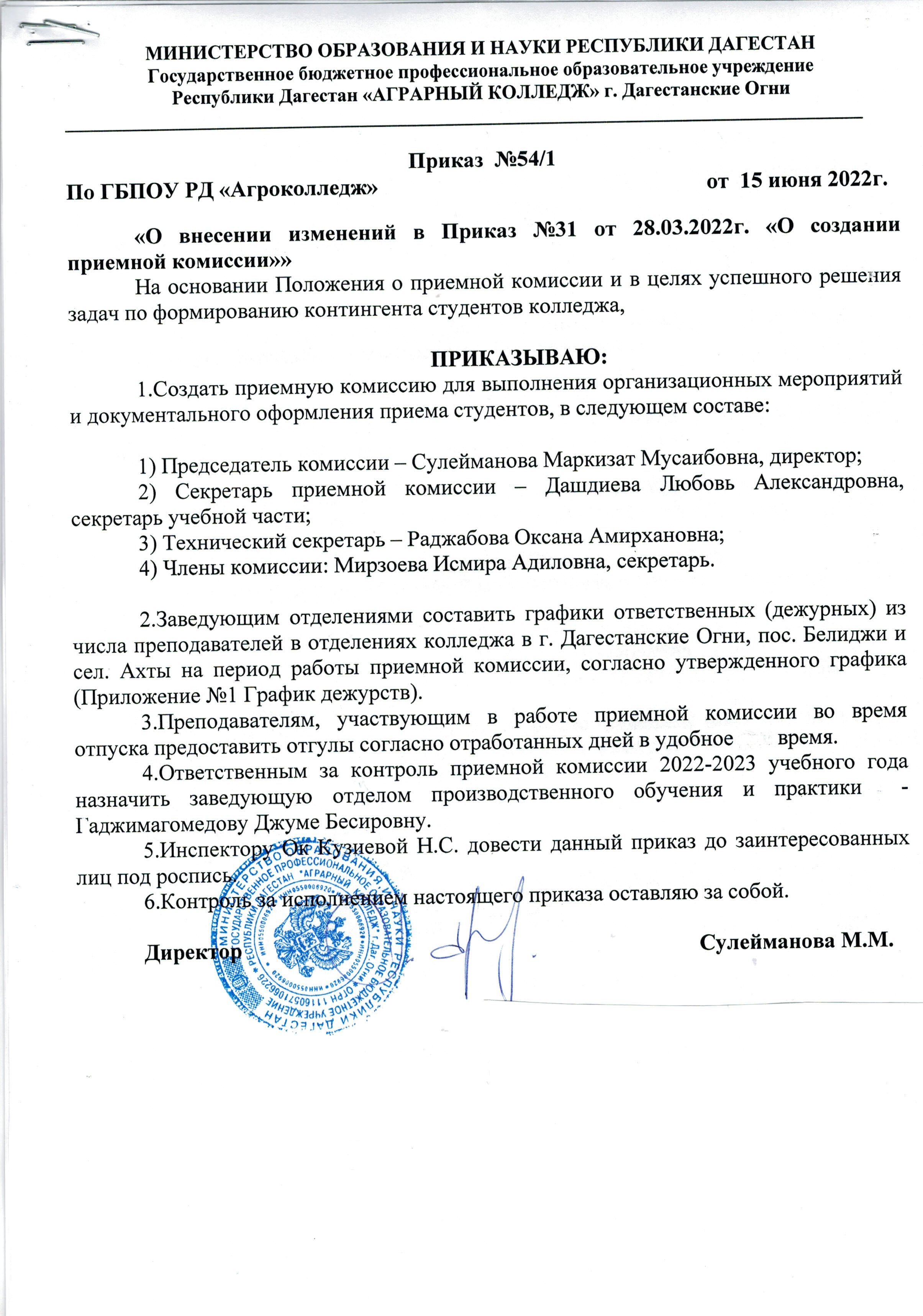 Приказ о создании приемной комиссии на 2022-2023 учебный год