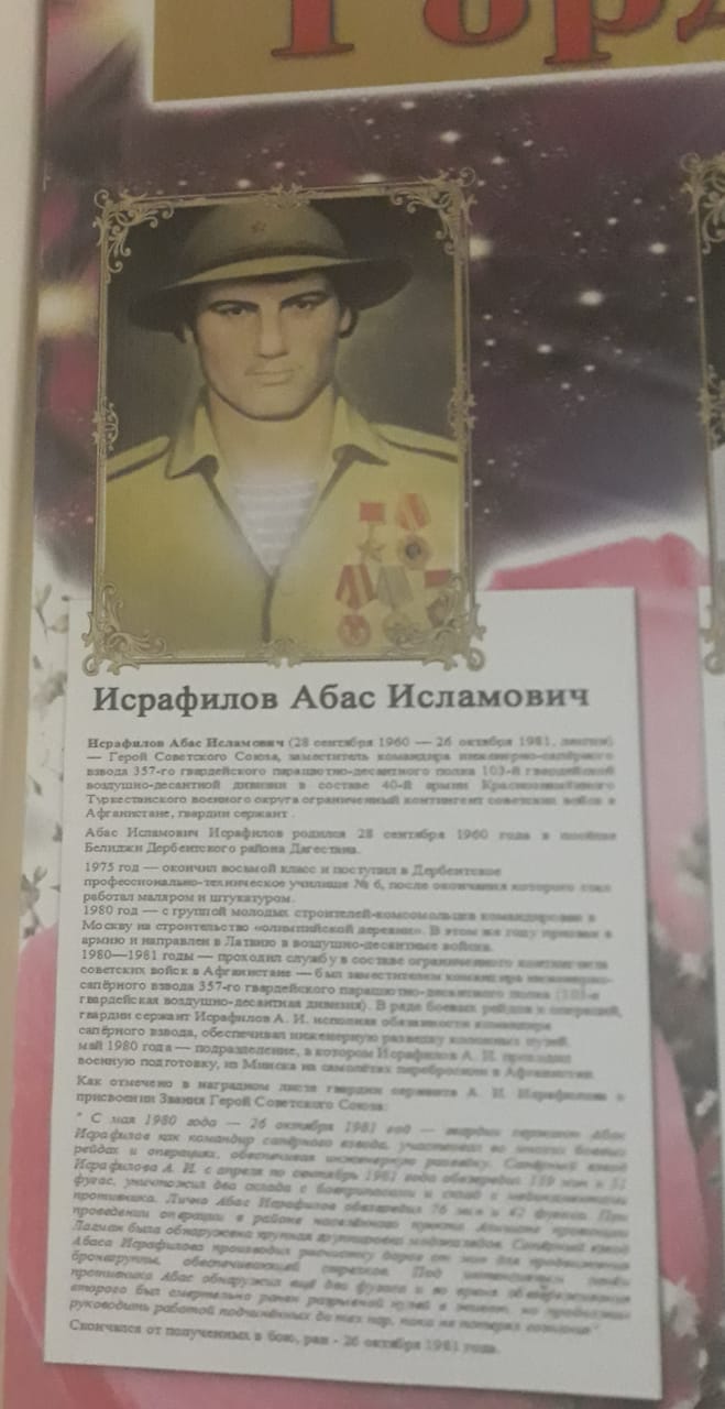 9 декабря 2020 года в День Героя России в структурном подразделении Аграрного колледжа в п. Белиджи прошло мероприятие в учебной группе №79 по профессии «Автомеханик» (кл. руководитель Байрамбеков Г.К.), посвященный Герою Советского Союза, родившегося, выросшего, получившего школьное образование в п. Белиджи, получившего профессиональное образование в г. Дербент – Абасу Исрафилову , воевавшего в Афганистане, своим героическим подвигом спасшего своих однополчан, но от полученных в бою ран скончался 26 октября 1981 года.