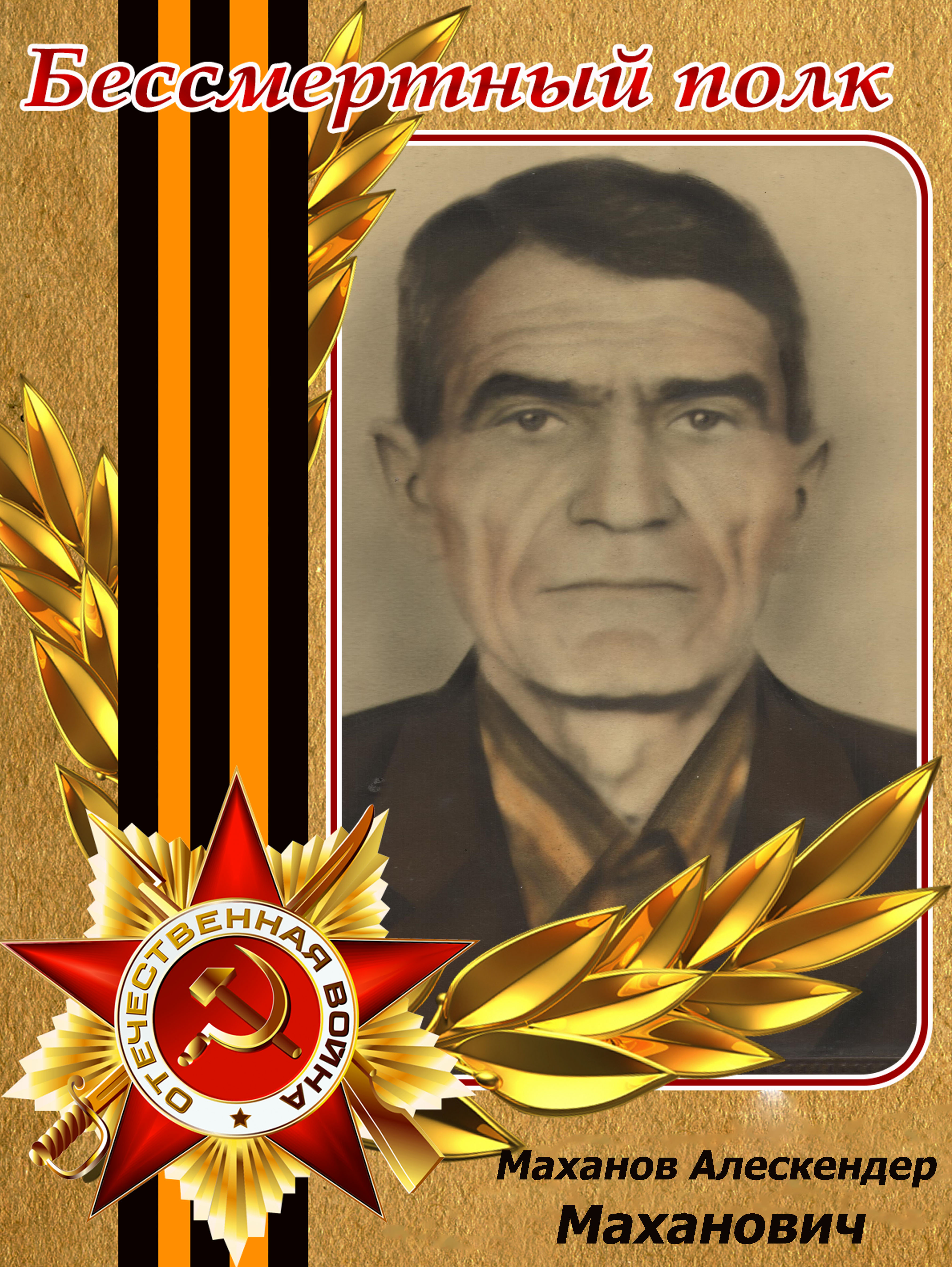 Мой прадед – Маханов Алескендер Маханович, родился в 1922 году в селе Дарваг, Табасаранского района. В 1941 году, как началась война, его призвали в военкомат Дербентского района. После военкомата он был отправлен в Азербайджан, где прошел курс молодого бойца. После чего его отправили на фронт в Украинскую ССР, где участвовал в оборонительных боях за Украину. Первое ранение он получил под Севастополем. Во время одной из контратак рядом с ним произошел взрыв, и он получил множество осколочных ранений. После чего его вынесли с поля боя и отвезли в полевой госпиталь. После восстановления его здоровья, он вернулся в строй. Спустя 2 года в 1943 году в одной из атак, где из 360 человек участвующих в атаке, он оказался среди десятка выживших в этой атаке, получил второе ранение.