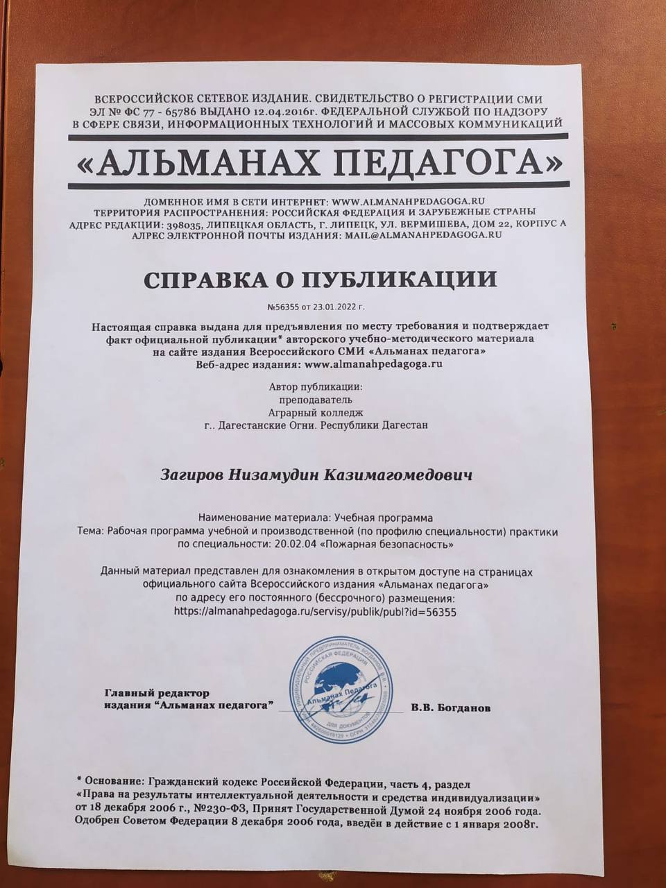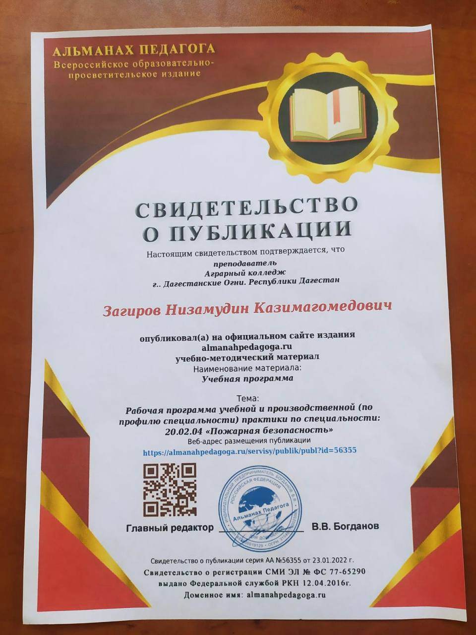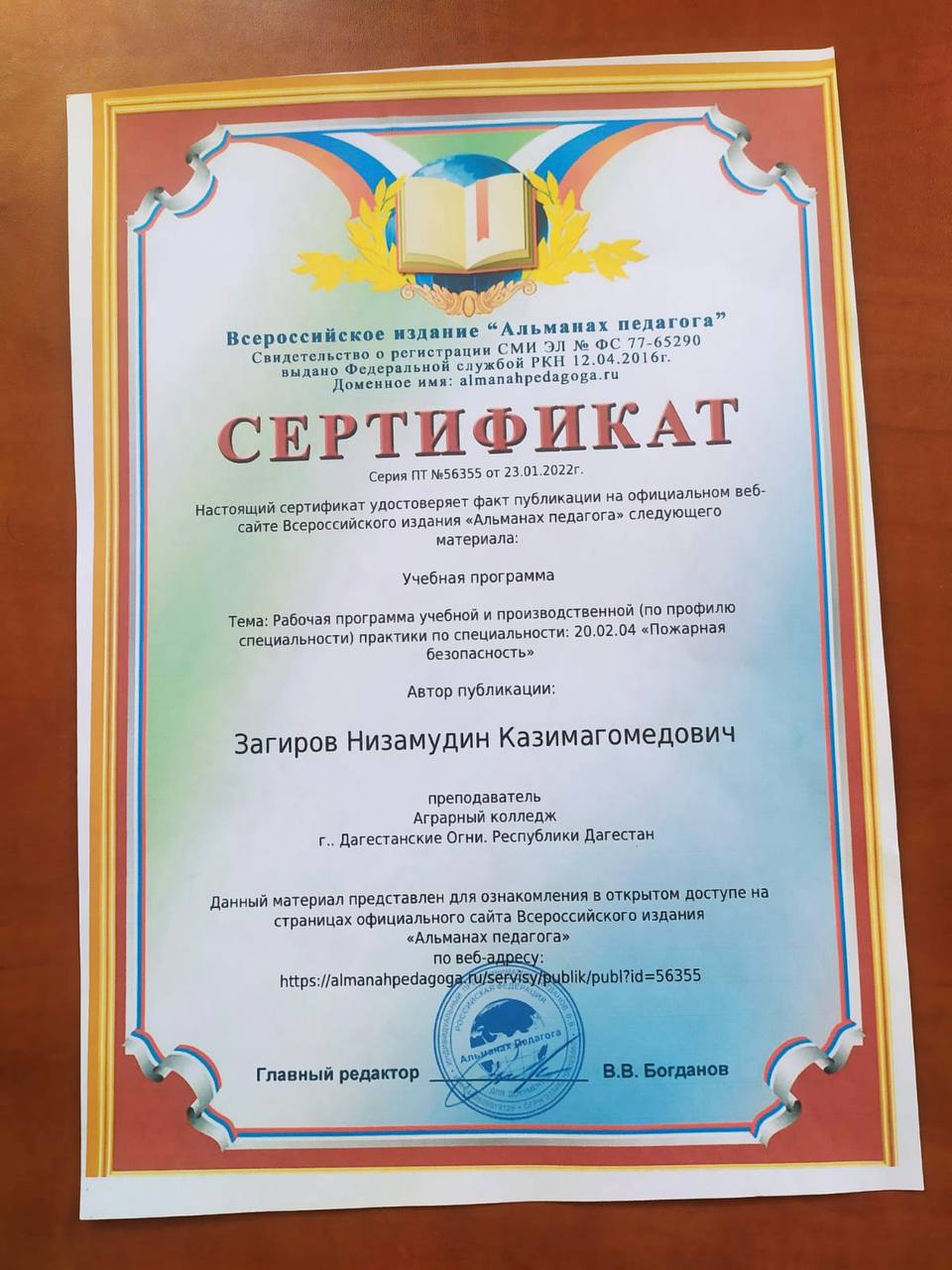 Преподаватель Аграрного колледжа по спецдисциплине Загиров Н.К. разработал и опубликовал на официальном веб-сайте Всероссийского издания «Альманах педагога» рабочую программу учебной и производственной практики по специальности 20.02.04 «Пожарная безопасность». Низамудин Казимагомедович получил сертификат и свидетельство о факте публикации учебно-методического материала.