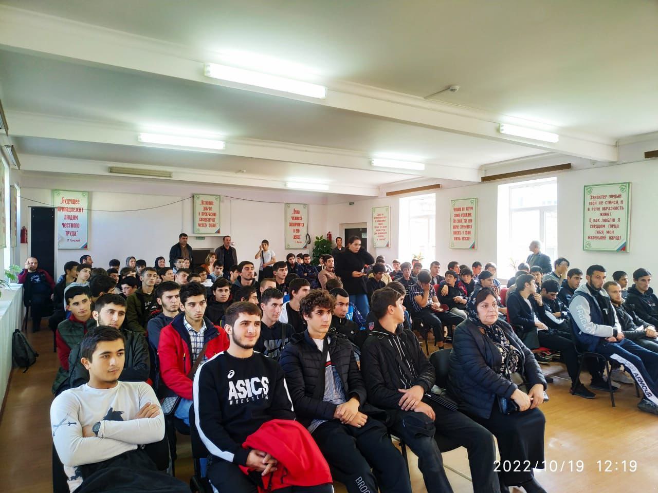 В соответствии с планом работы Аграрного колледжа на 2022 год, в целях формирования правовых и культурных ценностей, направленных на формирование негативного отношения к незаконному потреблению наркотических средств и психотропных веществ, профилактику употребления алкоголя и пропаганду здорового образа жизни в молодежной среде, в колледже с 10.10.2002 г по 29.10.2022г. проходит месячник среди студентов под девизом: «Как прекрасен этот мир!». Задачи: 1. Приобщить студентов и их родителей к здоровому образу жизни. 2. Развивать креативность, творческую активность студентов. 3.Прививать интерес к спорту, физическим упражнениям. 4. Воспитывать у детей потребность быть здоровыми, не бояться лечиться. Основной целью проведения месячника стала: активизация профилактической работы по предупреждению правонарушений среди несовершеннолетних, профилактика злоупотребления психо-активными веществами, воспитание нравственности и пропаганды здорового образа жизни. Мероприятия проводились по трем направлениям: Направление 1. «Нет наркотикам!» Направление 2. «Жизнь без табака». Направление 3. «Трезвость – норма жизни» 19.10.2022г Проведедено мероприятие по теме «Наркотики болезнь Века!» Подготовили мероприятие социально-психологическая служба с приглашением гостей : Врач нарколог Касимова Л.Г,Инспектор по Уголовному розыску г.Даг.Огни Сиражутдин Насеритдинович а так же студенты с 1- 2 курсов.