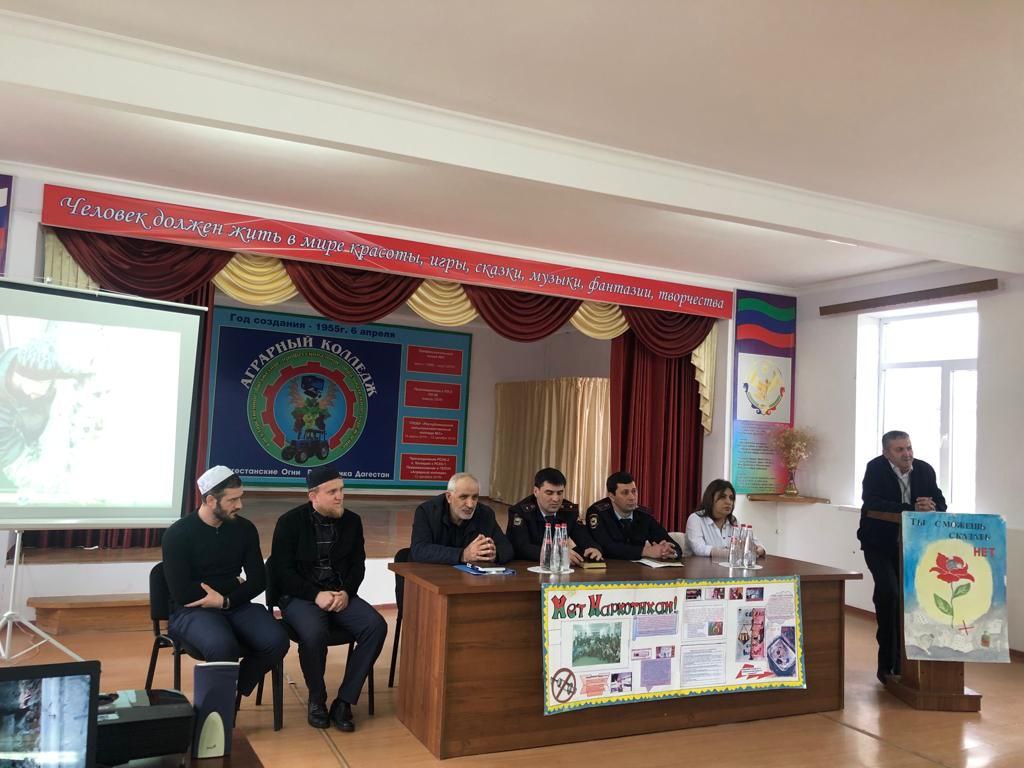 6 апреля в рамках всероссийской межведомственной комплексной оперативно-профилактической операции «Дети России — 2023» в Аграрном колледже при содействие социально-психологической службы, проведено мероприятие по профилактике наркомании среди обучающихся, направленное на формирование негативного отношения к потреблению наркотиков и пропаганду здорового образа жизни. В мероприятии приняли участие: Врач нарколог Касимова Л.Г,Опер уполномоченный по уголовному розыску по линии НОН Мирзоев С.Н,майтор полиции старший инспектор ПДН Казибеков Р.М.Встреча прошла в форме профилактической беседы «Беда, которую несут наркотики». В ходе беседы обсуждали вопросы негативного воздействия наркотиков на физическое здоровье человека и его социальное благополучие, формирование у подростков ценностного, ответственного отношения к своему здоровью, готовность соблюдать законы здорового образа жизни и способность осознанной готовности отказаться от любых форм использования наркотиков. Также обучающимся был показан антинаркотический клип «Профилактика ПАВ»