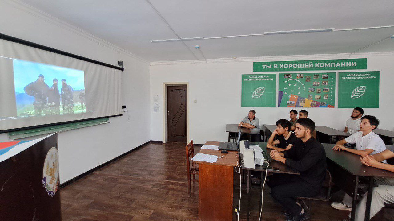 4. Просмотр документального фильма «Горячее лето 1999 г. Дагестан-Ботлих». По окончании просмотра документального фильма кураторы обсудили фрагменты просмотренных кадров с обучающимися. Задавали вопросы: «Что запомнилось вам из просмотренного документального фильма? Согласны ли вы со словами очевидцев тех событий?»