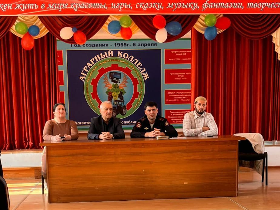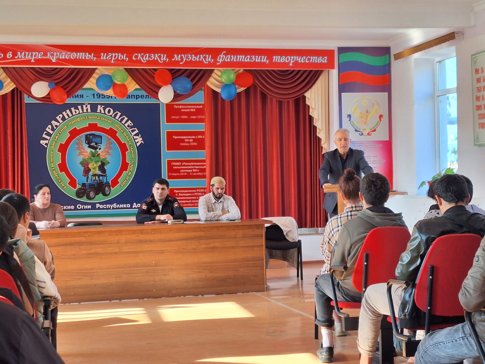 Сегодня, 30 октября, в актовом зале ГБПОУ РД «Аграрный колледж» была проведена беседа на тему: "Последствия несанкционированных митингов" со студентами и преподавателями. На встречу были приглашены инспектор ПДН Казибеков Р.М., представитель отдела просвещения при муфтияте РД Сефербеков С.Н. Зам. директора по УР Курбанов И.Т. акцентировал своё внимание на недопустимости вовлечения и участия студентов в несанкционированных митингах и акциях, как в реальной жизни, так и в социальных сетях.