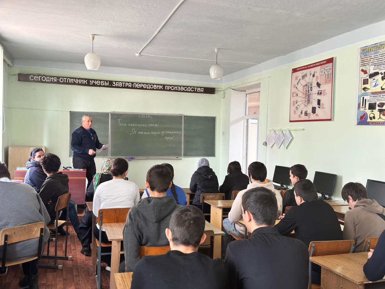 11 марта в рамках проекта "Разговоры о важном" в учебном корпусе №2 ГБПОУ РД "Аграрный колледж" прошёл классный час на тему: "От южных морей до полярного края". Куратор группы № 47 Загиров Н.К. рассказал о нашей необъятной Родине. Студенты были активно вовлечены в процесс обсуждения темы. |
