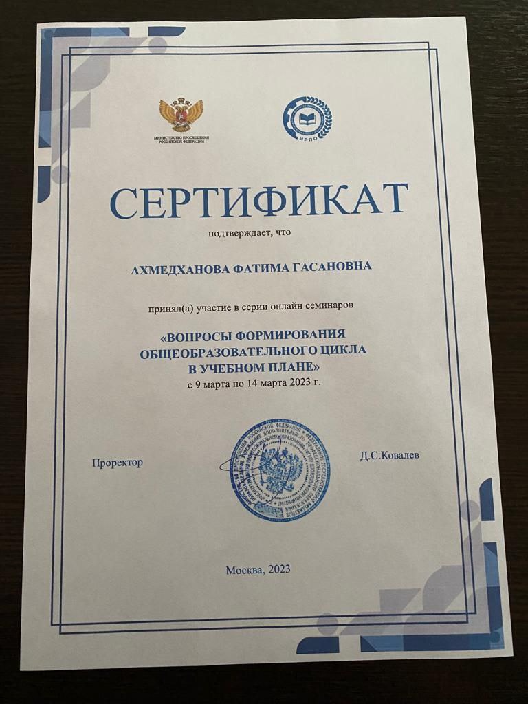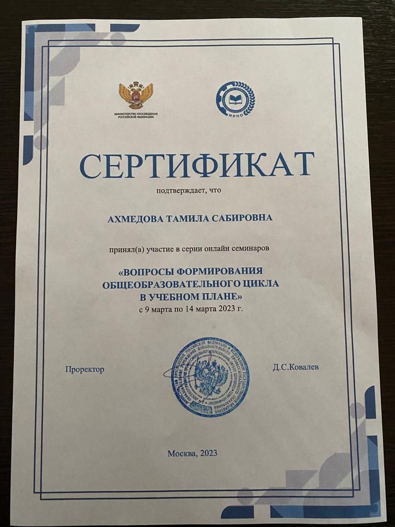 С 9 по 14 марта методист Ахмедханова Ф.Г. и зав.метод кабинетом Ахмедова Т.С. приняли участие в серии онлайн семинаров на тему: «Вопросы формирования общеобразовательного цикла в учебном плане».