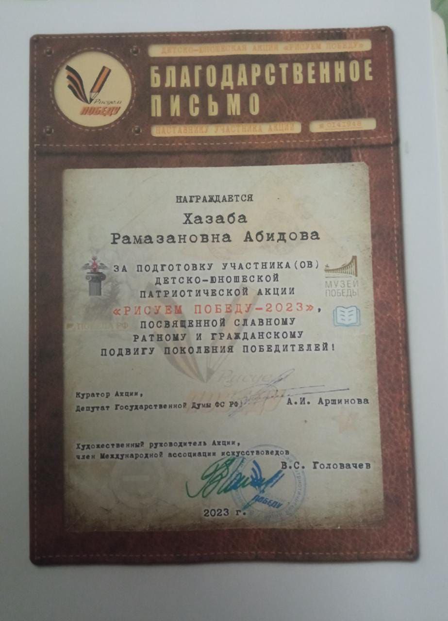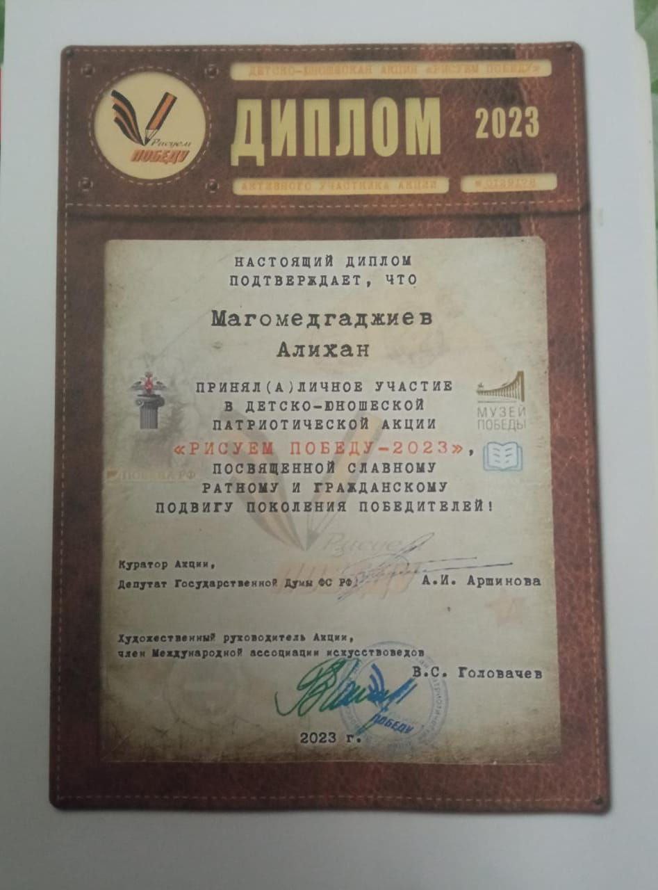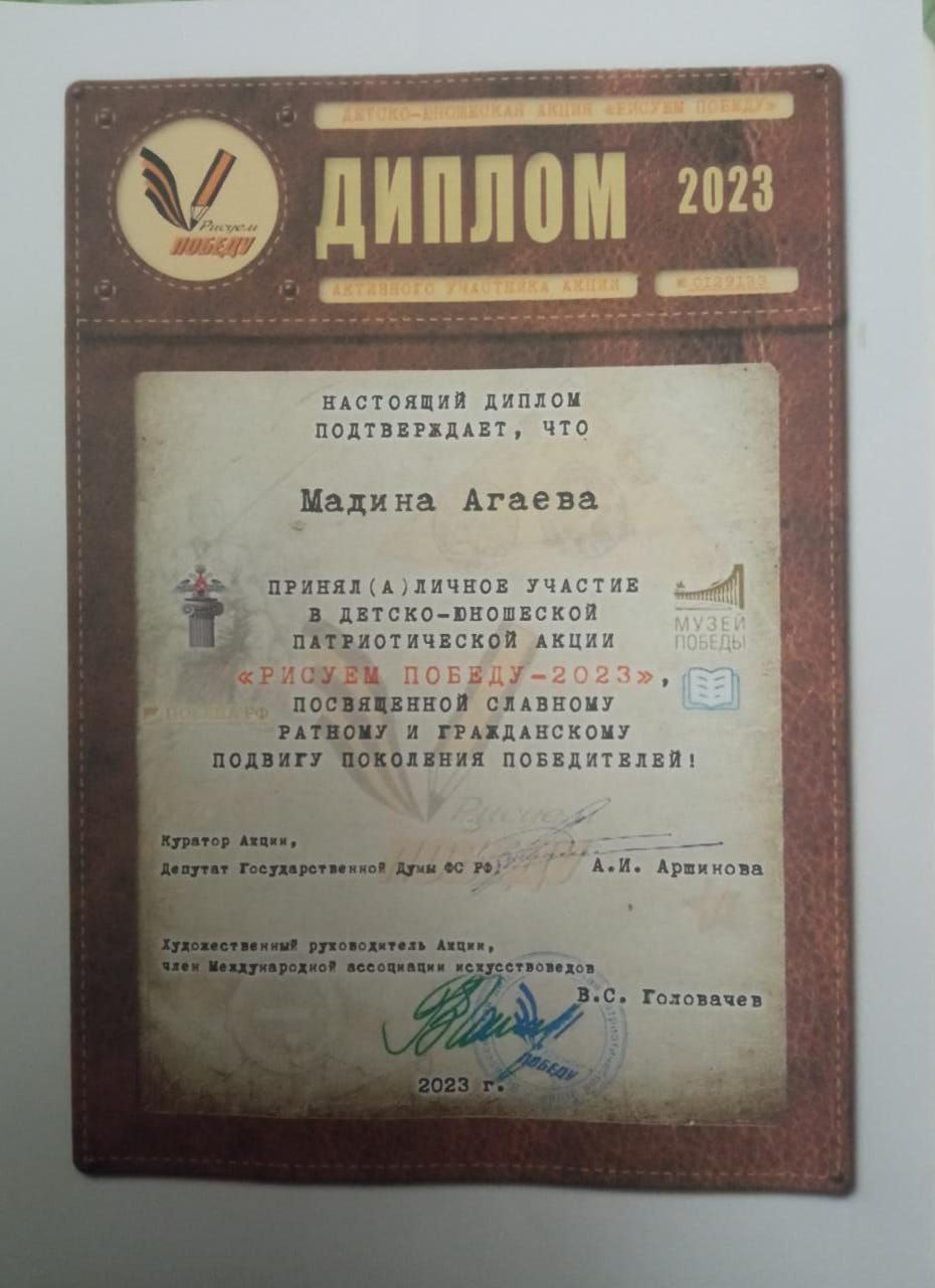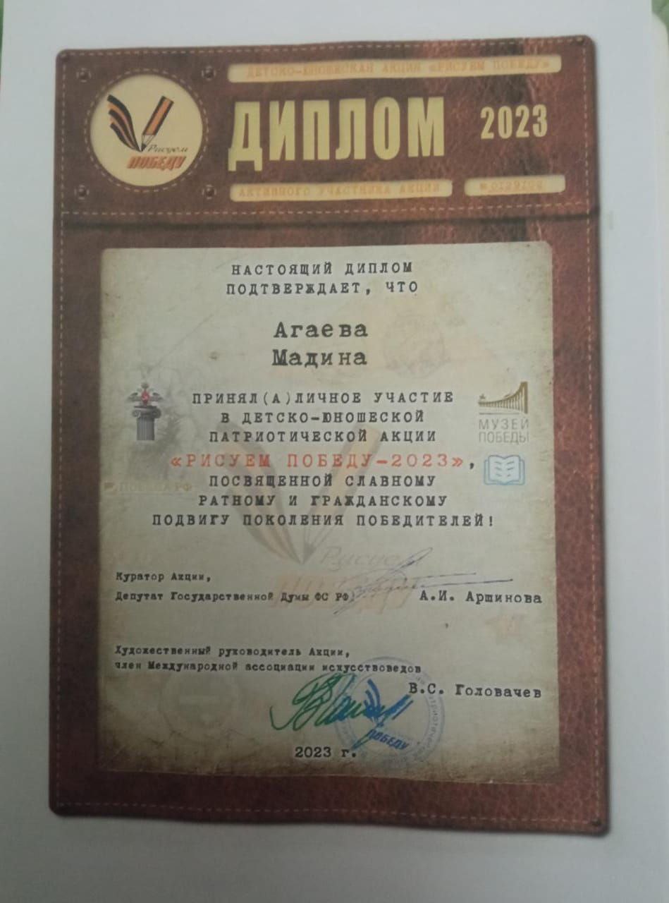 Студенты Аграрного колледжа в рамках Федерального партийного проекта "Новая школа" приняли участие во Всероссийском конкурсе "Рисуем Победу" в Номинации: -Детское художественное творчество и декоративно- прикладное искусство; Методическая разработка; Наследники великой Победы; Рисуем Победу. 1)Агаева Мадина, студентка 2 курса 9гр. 2) Курбанов Марат, студент 3курса 94гр. 3) Ахмедов Ахмед, студент 3 курса 93гр. 4) Шабанов Адам,студент 3курса 93гр. 5) Магомедгаджиев Алихан студент 2 курса 8гр. Подготовила преподаватель: Абидова Хазаба Рамазановна.
