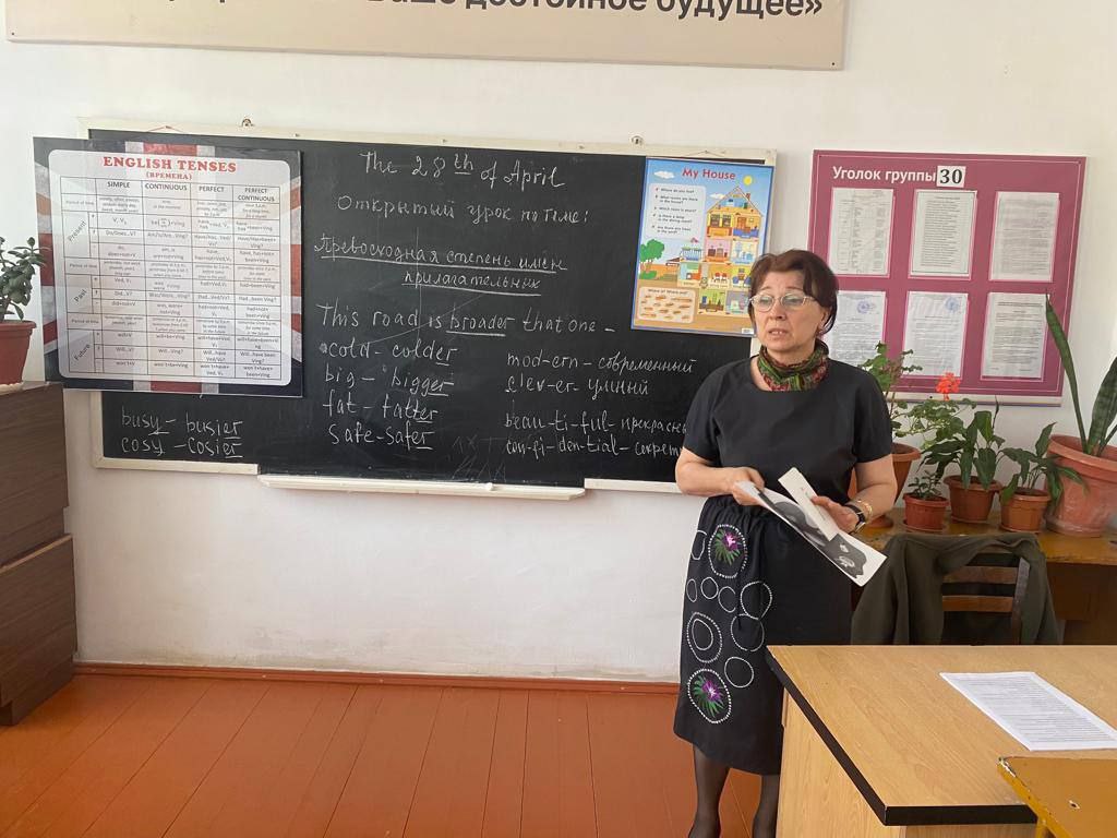 Преподаватель Гаджибекова Г.Д. 28.04.2023г в соответствии с графиком провела открытый урок по английскому языку на тему: «Превосходная степень прилагательных» .