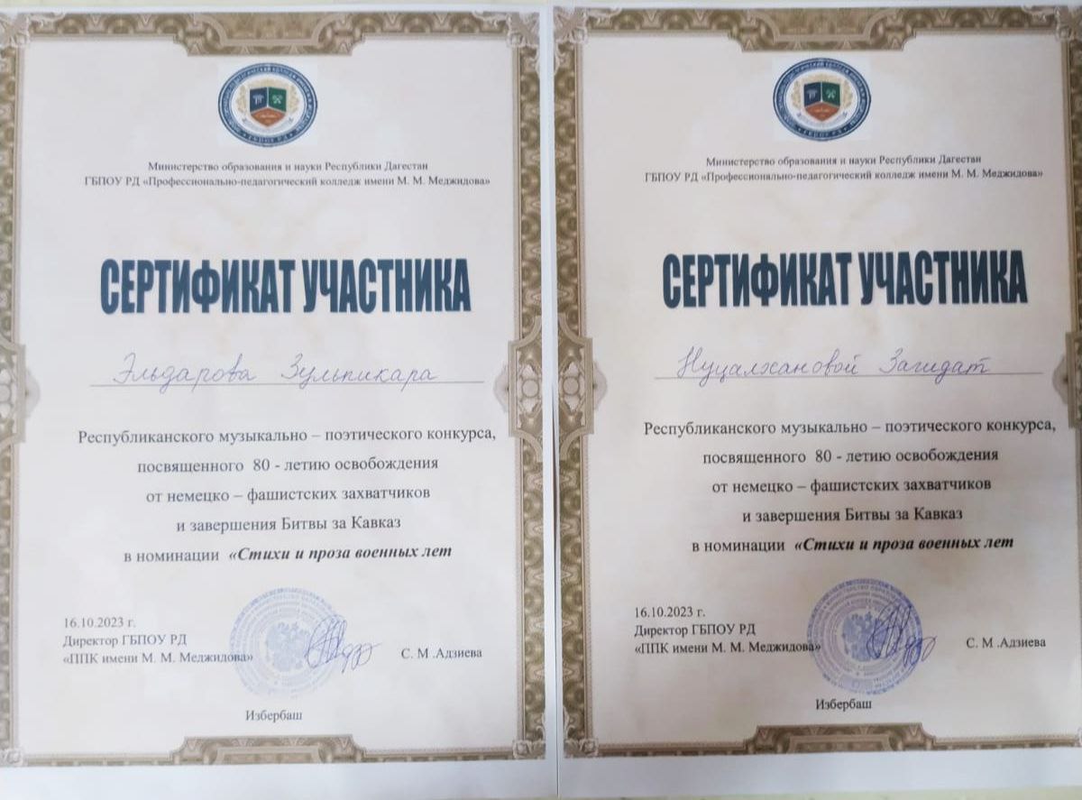 16 октября, под руководством педагога-организатора ОБЖ Пашаева С. З., студенты ГБПОУ РД "Аграрный колледж" Нуцалханова Загидат и Эльдаров Зульфикар участвовали в музыкально-поэтическом конкурсе в номинации "Стихи и проза", посвящённом 80-летию освобождения от немецко-фашистских захватчиков и завершению Битвы за Кавказ.
